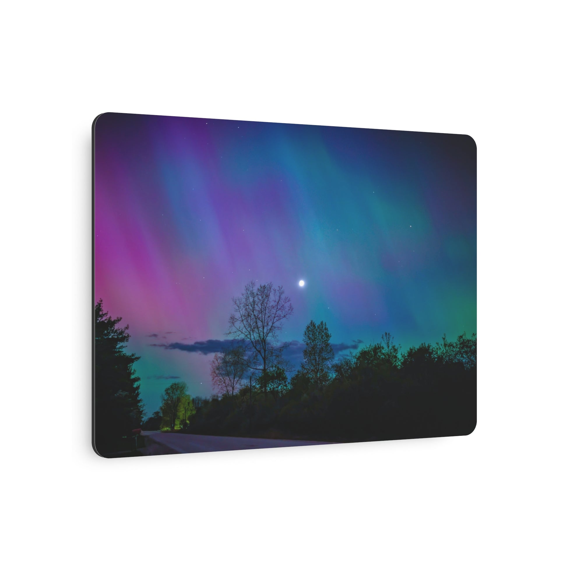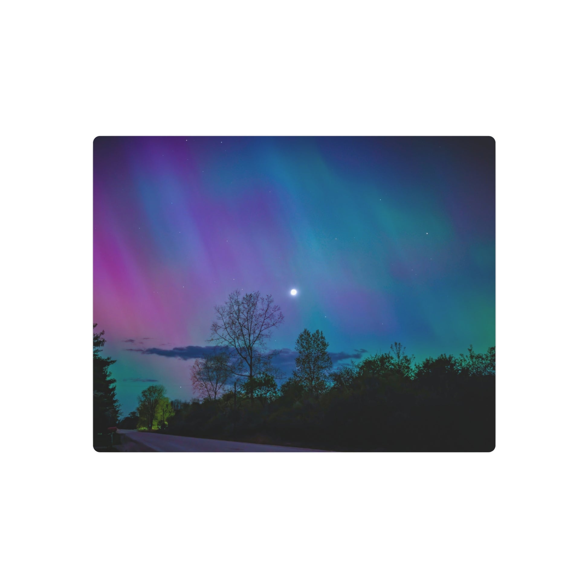 Immerse yourself in the enchanting tranquility of “Lunar Whisper Amidst the Aurora’s Embrace,” a captivating metal print that brings the magic of the Northern Lights into your home. This exquisite piece features a rare and mesmerizing scene where the vibrant dance of the auroras meets the delicate crescent of a moonlit sky. The print captures the vivid pinks, purples, blues, and greens of the aurora borealis as they illuminate a serene country road, flanked by the silent silhouettes of trees. Above, the sliver moon casts a gentle glow, adding a touch of mystique to the star-studded heavens. Each glance at this artwork promises a moment of peace, as if nature itself has paused in admiration of its own beauty. Perfect for those who seek a slice of the celestial in their daily lives, this metal print is not just a visual treat; it’s a soulful journey to the heart of the night sky.
