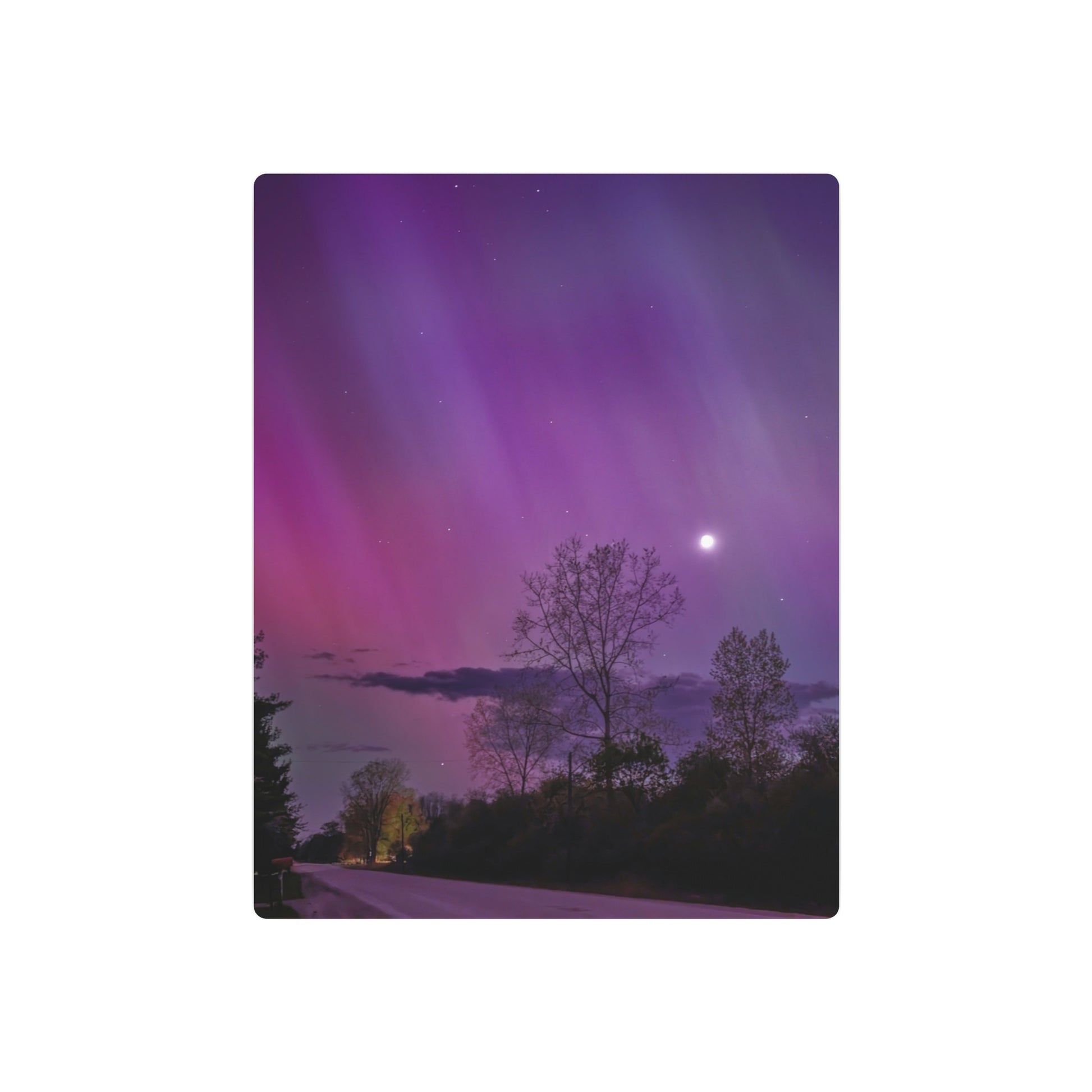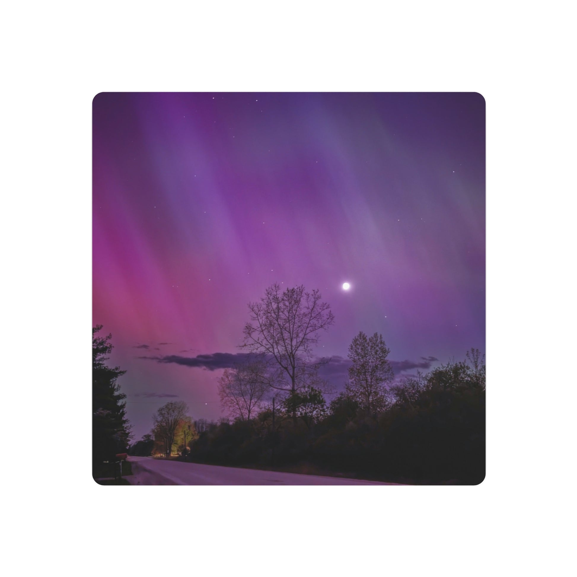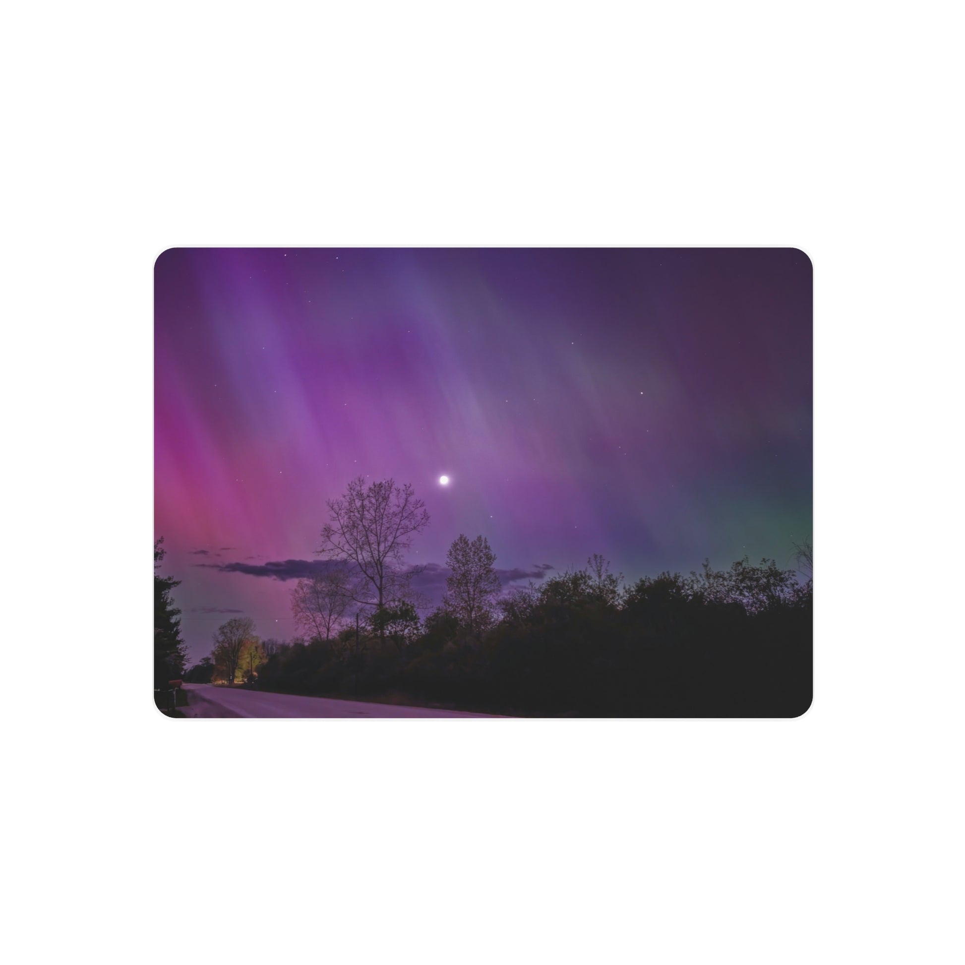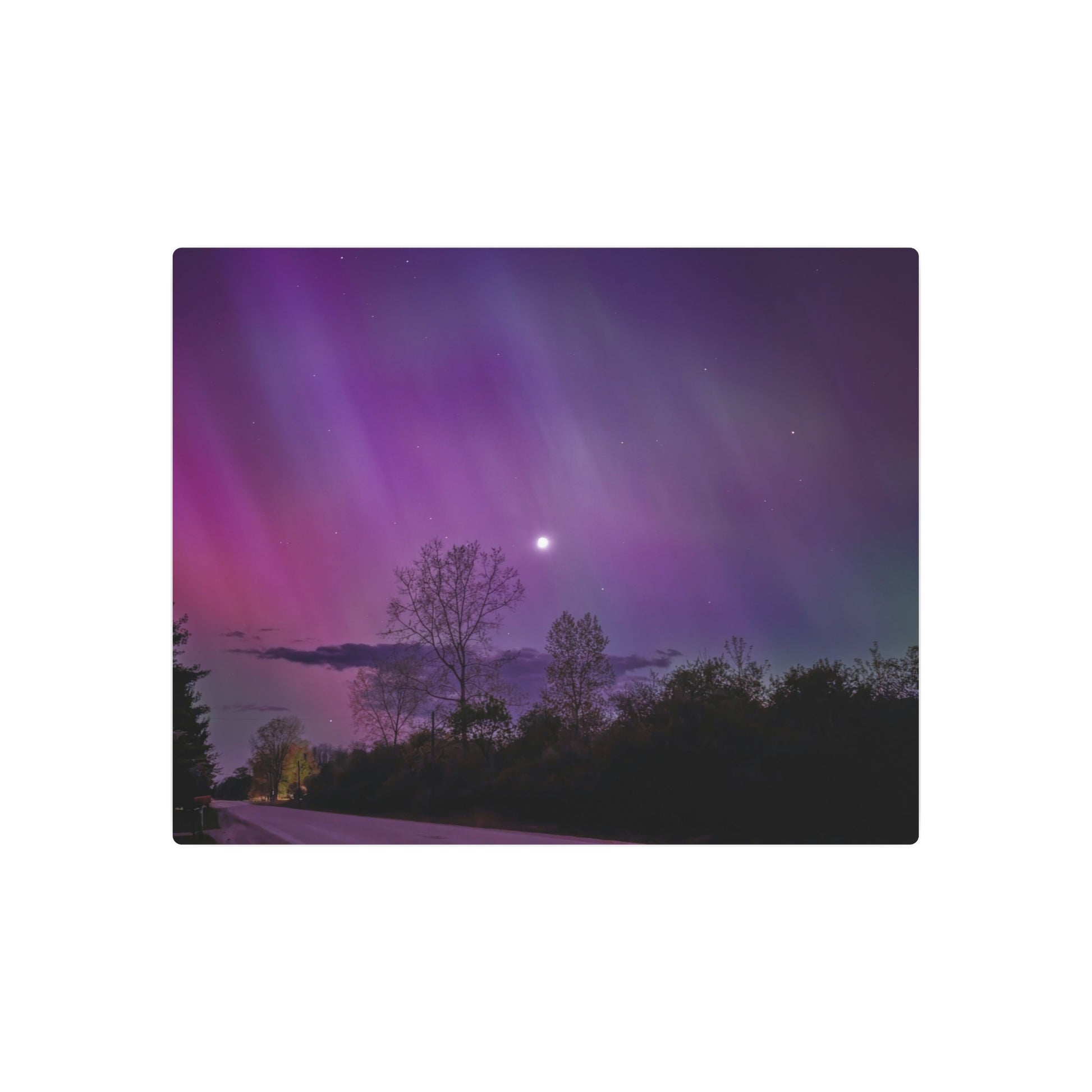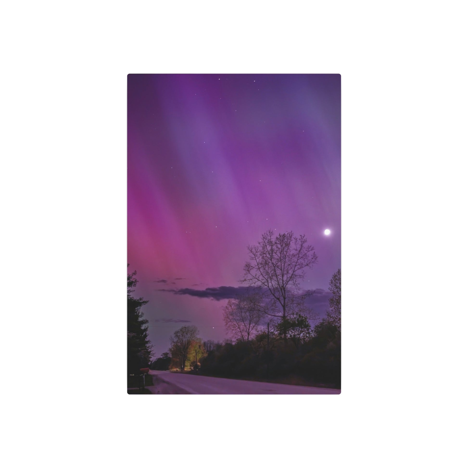 Under the celestial dance of the Northern Lights, a country road in Michigan becomes a stage for nature’s silent symphony. A lone tree, etched in silhouette against the cosmic display, stands as a timeless witness to the universe’s quiet conversation. Above, a sliver of the moon casts a gentle glow, adding a touch of serenity to the scene. This moment, captured in stillness, is an invitation to wander, wonder, and wanderlust under the Michigan skies.
