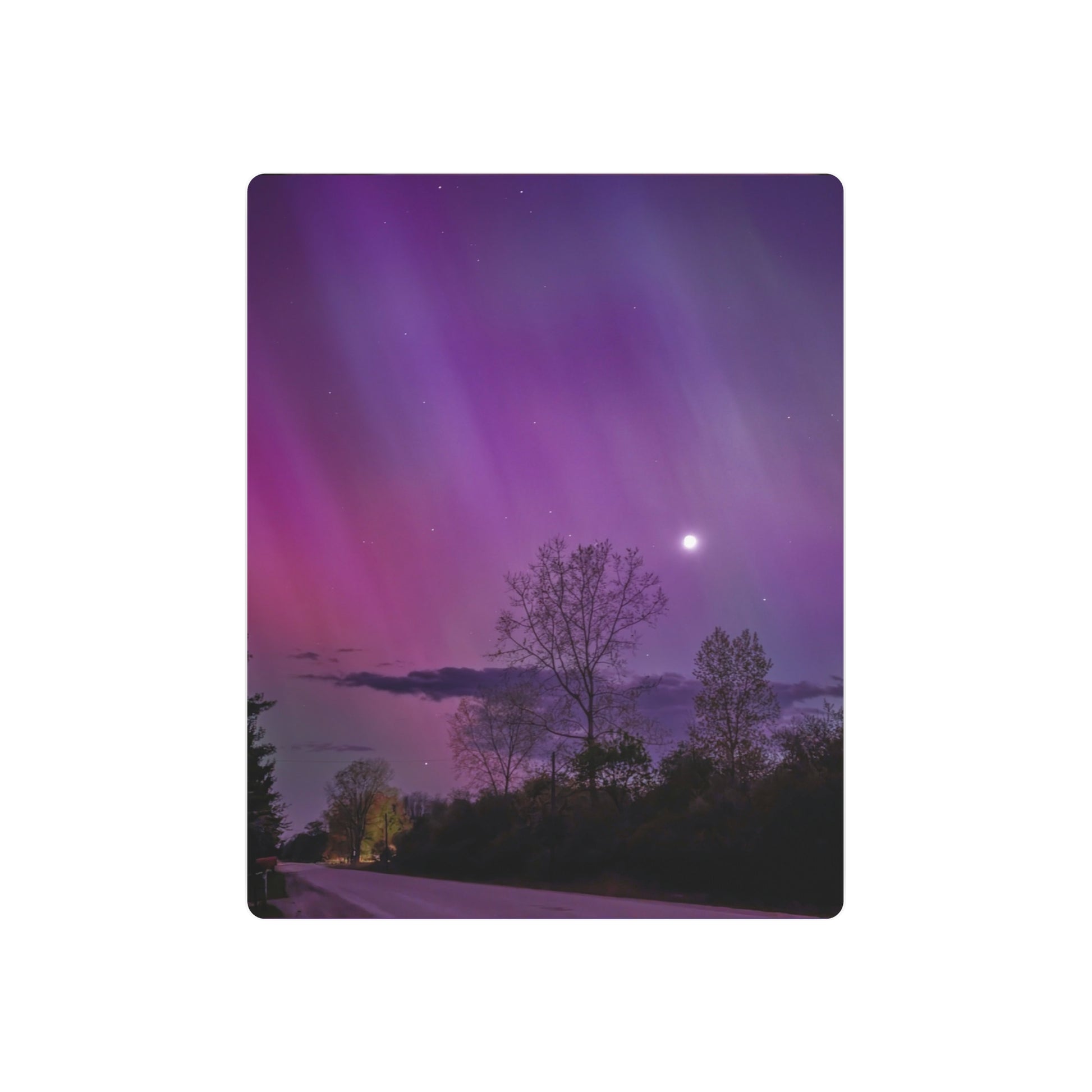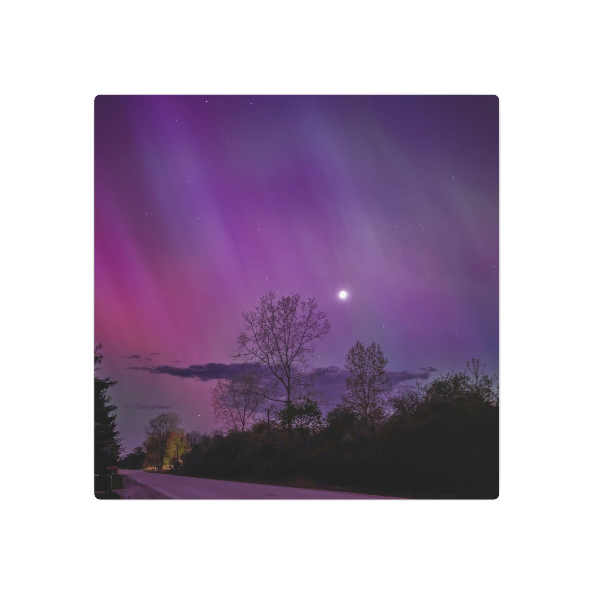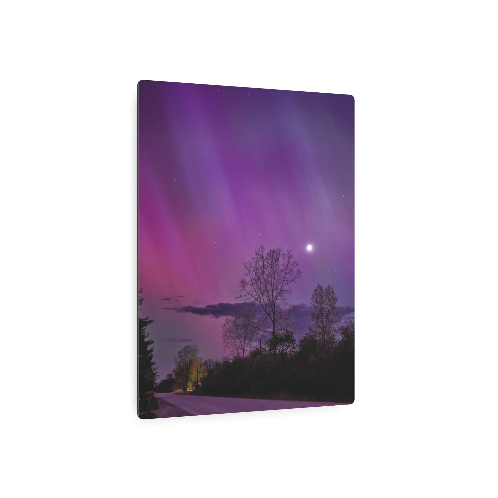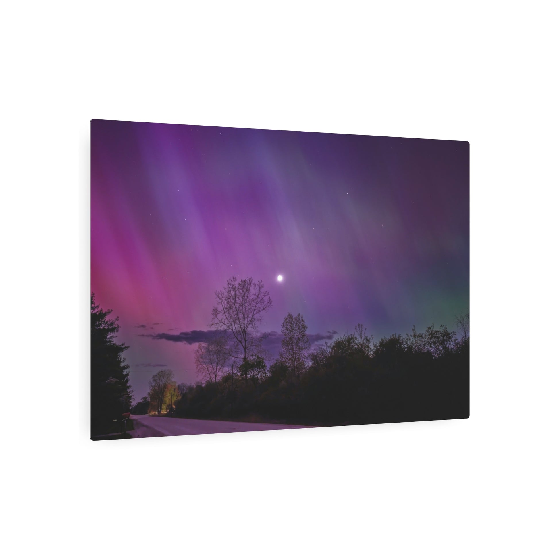 Under the celestial dance of the Northern Lights, a country road in Michigan becomes a stage for nature’s silent symphony. A lone tree, etched in silhouette against the cosmic display, stands as a timeless witness to the universe’s quiet conversation. Above, a sliver of the moon casts a gentle glow, adding a touch of serenity to the scene. This moment, captured in stillness, is an invitation to wander, wonder, and wanderlust under the Michigan skies.