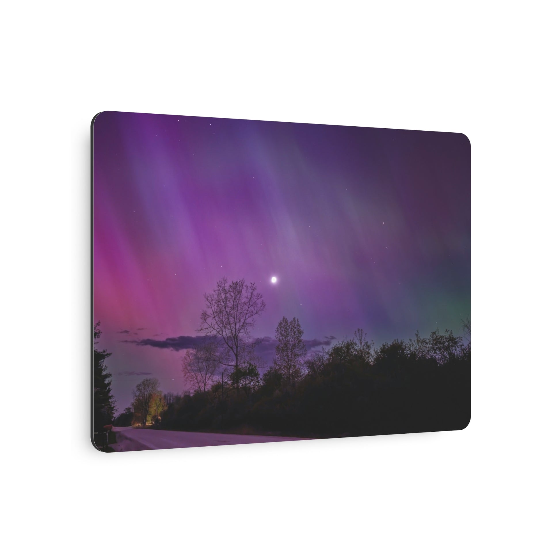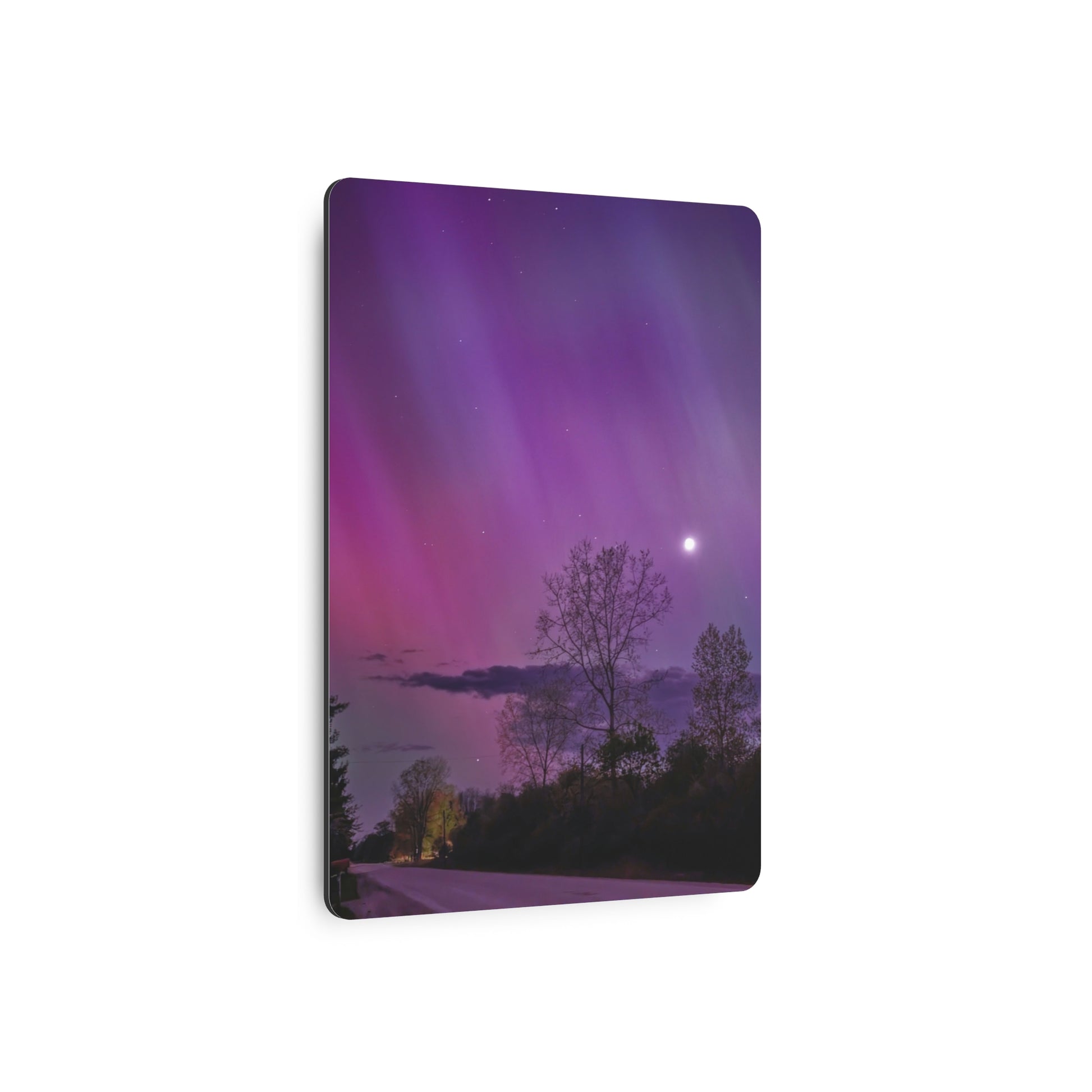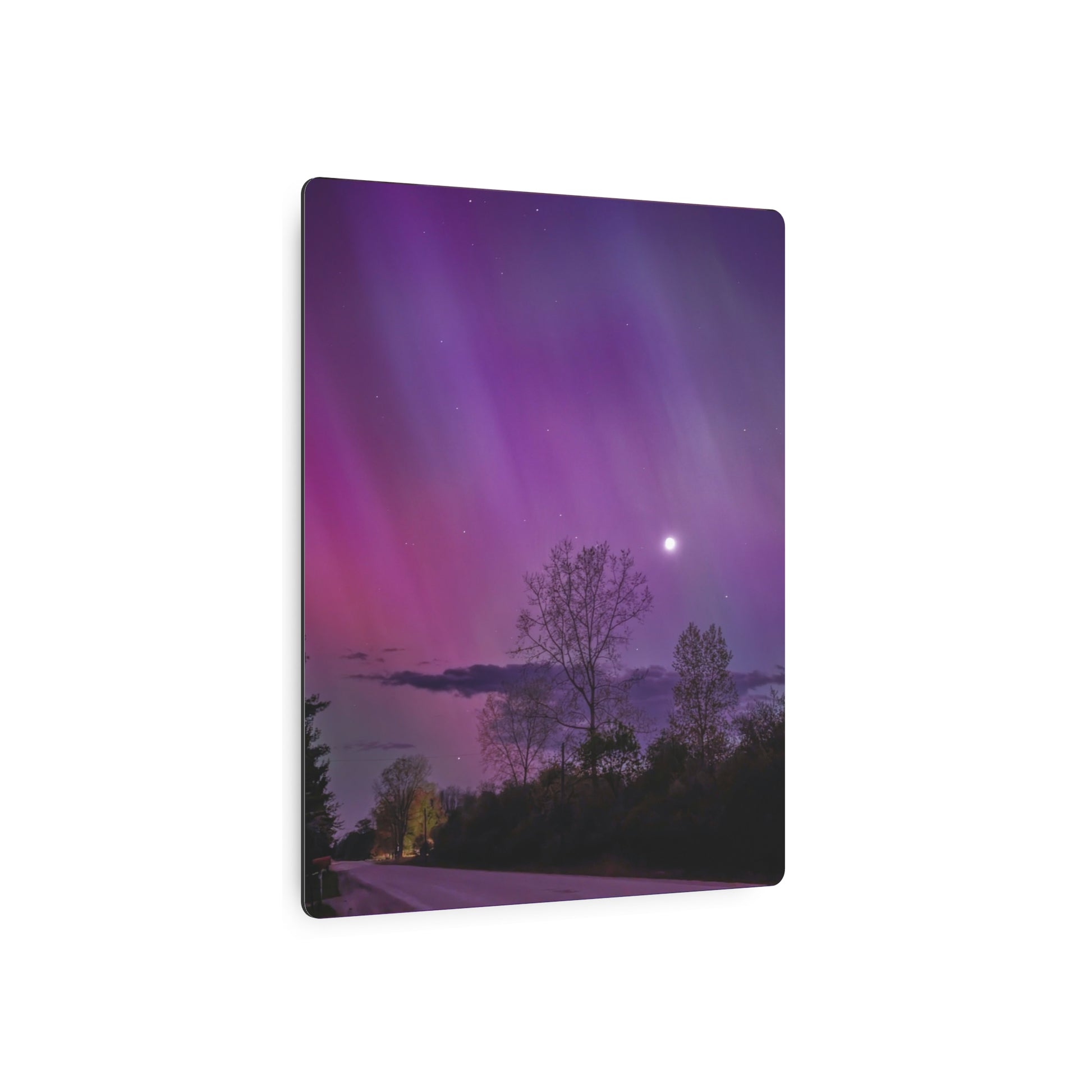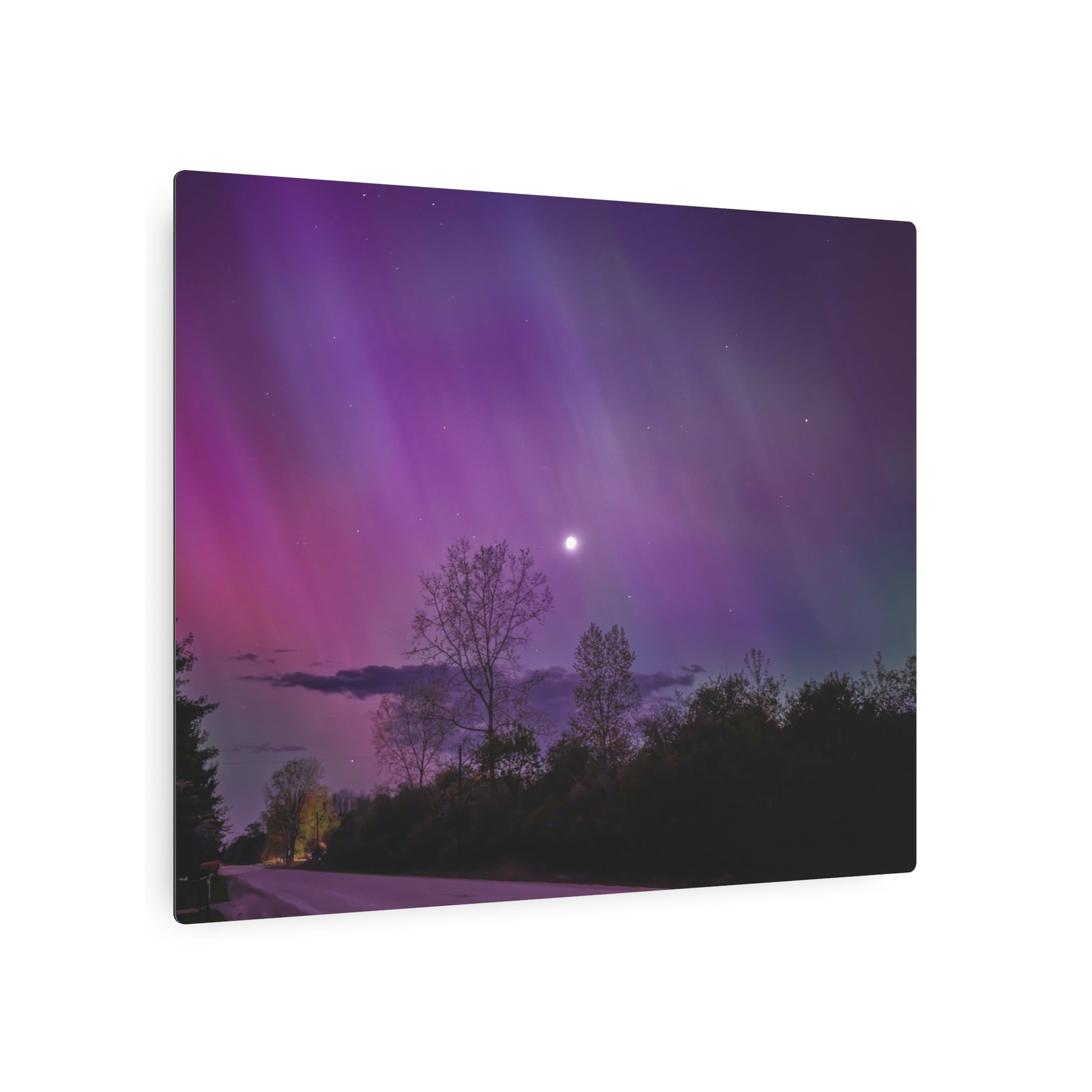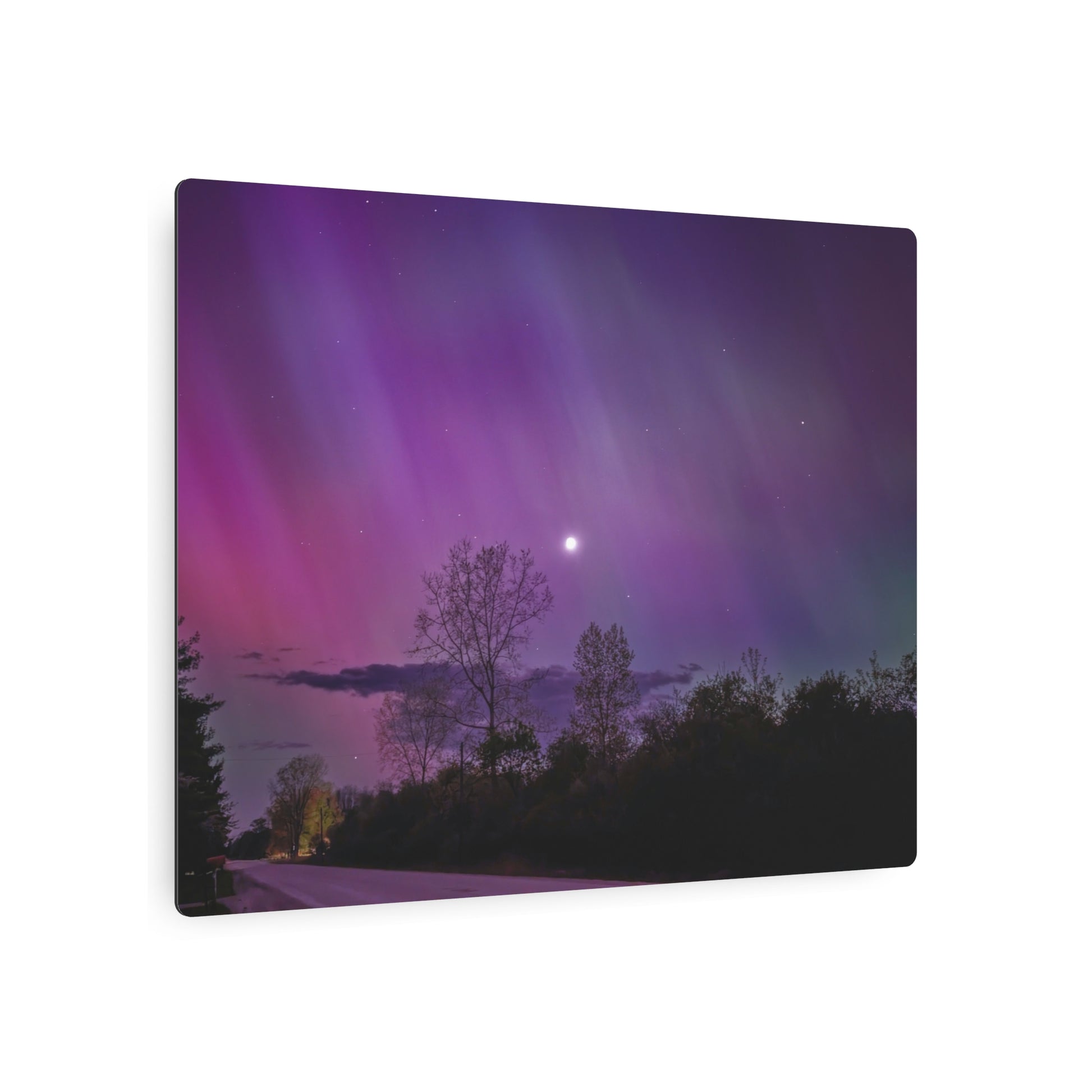 Under the celestial dance of the Northern Lights, a country road in Michigan becomes a stage for nature’s silent symphony. A lone tree, etched in silhouette against the cosmic display, stands as a timeless witness to the universe’s quiet conversation. Above, a sliver of the moon casts a gentle glow, adding a touch of serenity to the scene. This moment, captured in stillness, is an invitation to wander, wonder, and wanderlust under the Michigan skies.