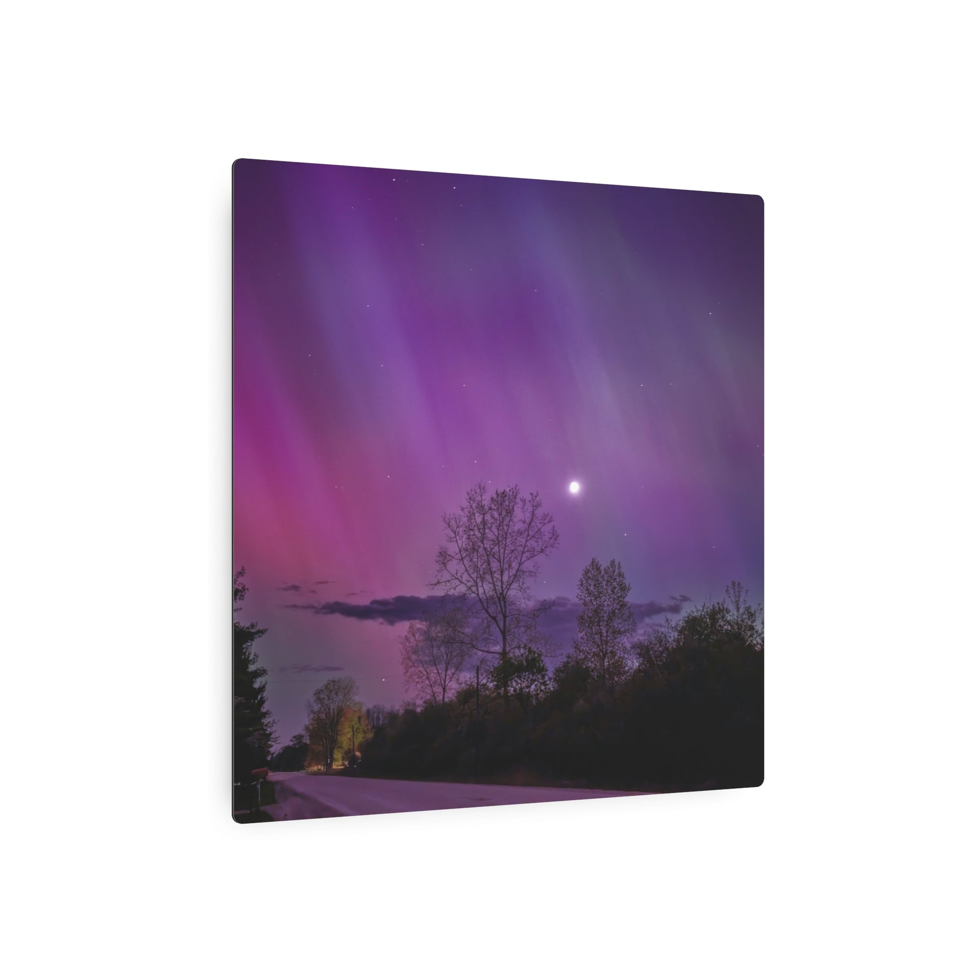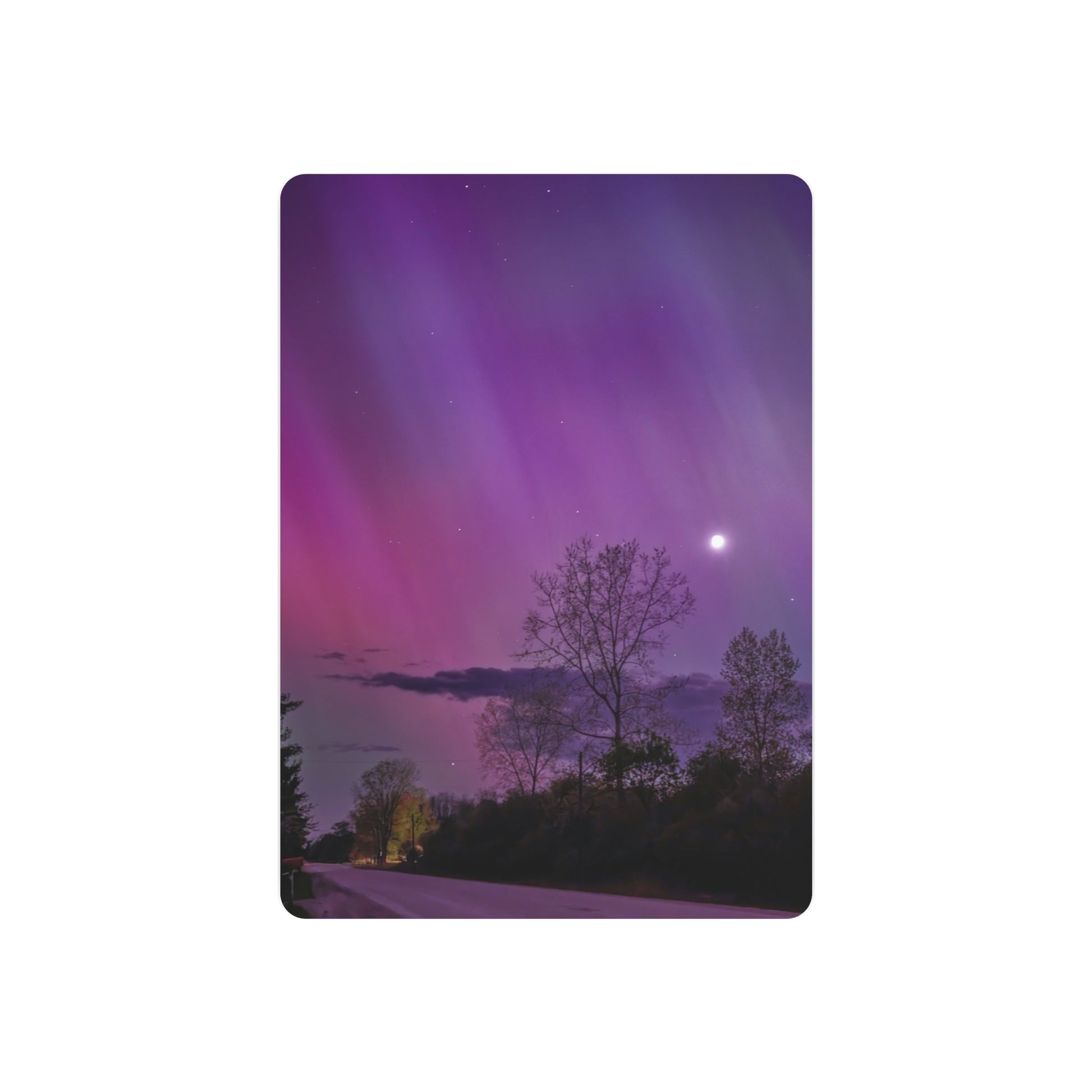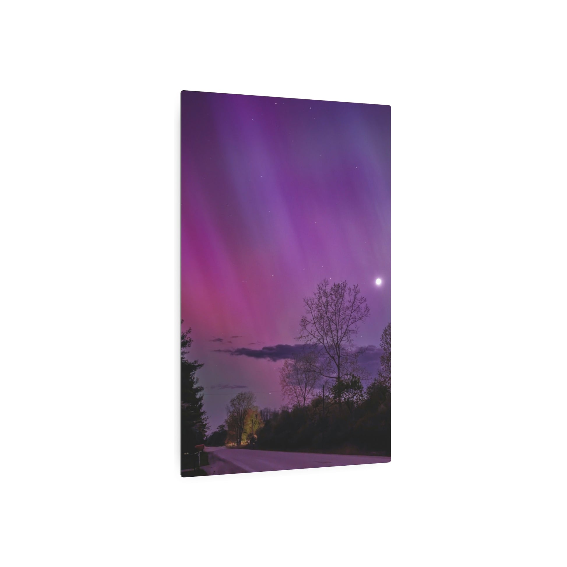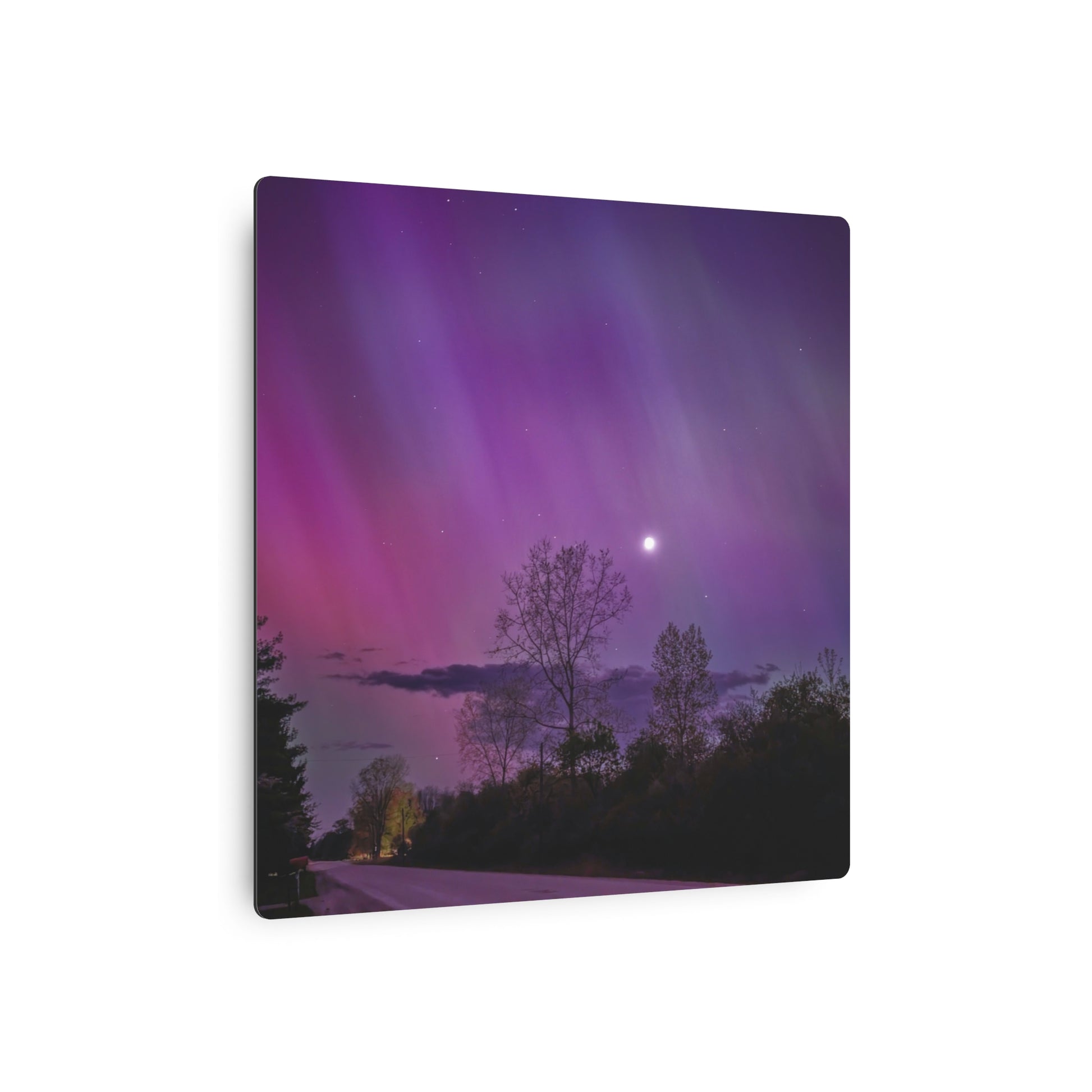 Under the celestial dance of the Northern Lights, a country road in Michigan becomes a stage for nature’s silent symphony. A lone tree, etched in silhouette against the cosmic display, stands as a timeless witness to the universe’s quiet conversation. Above, a sliver of the moon casts a gentle glow, adding a touch of serenity to the scene. This moment, captured in stillness, is an invitation to wander, wonder, and wanderlust under the Michigan skies.