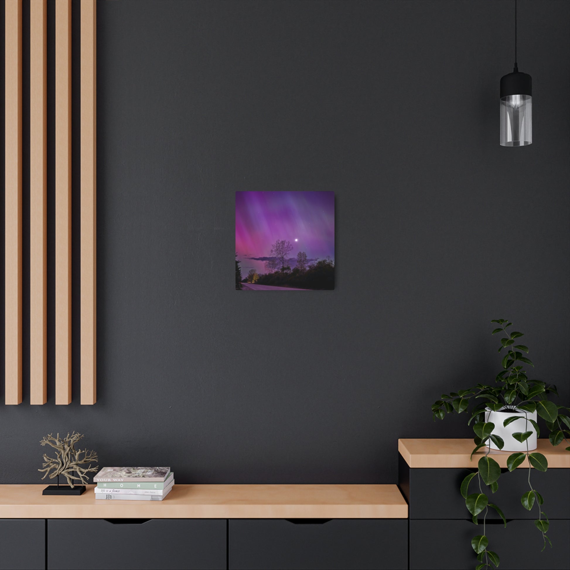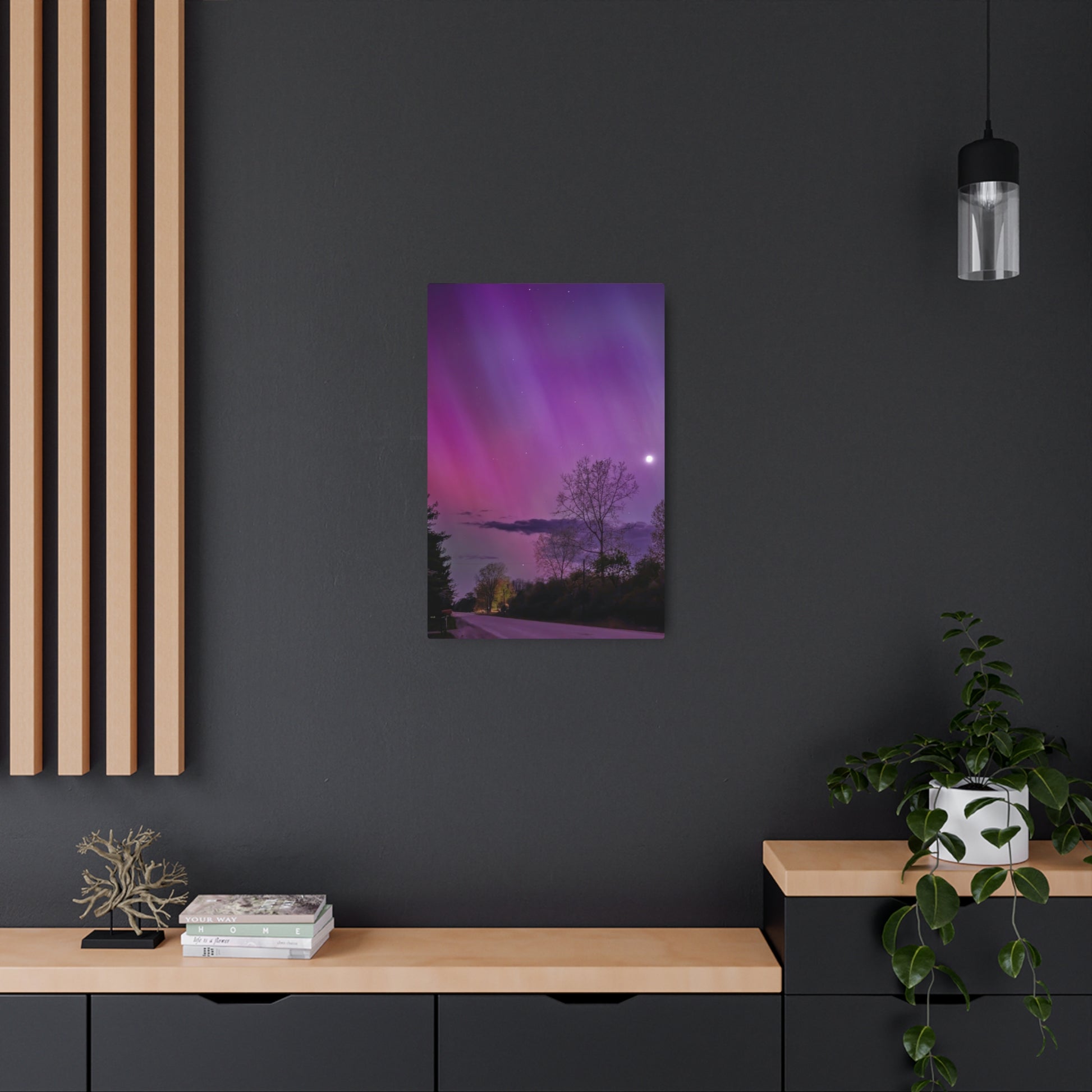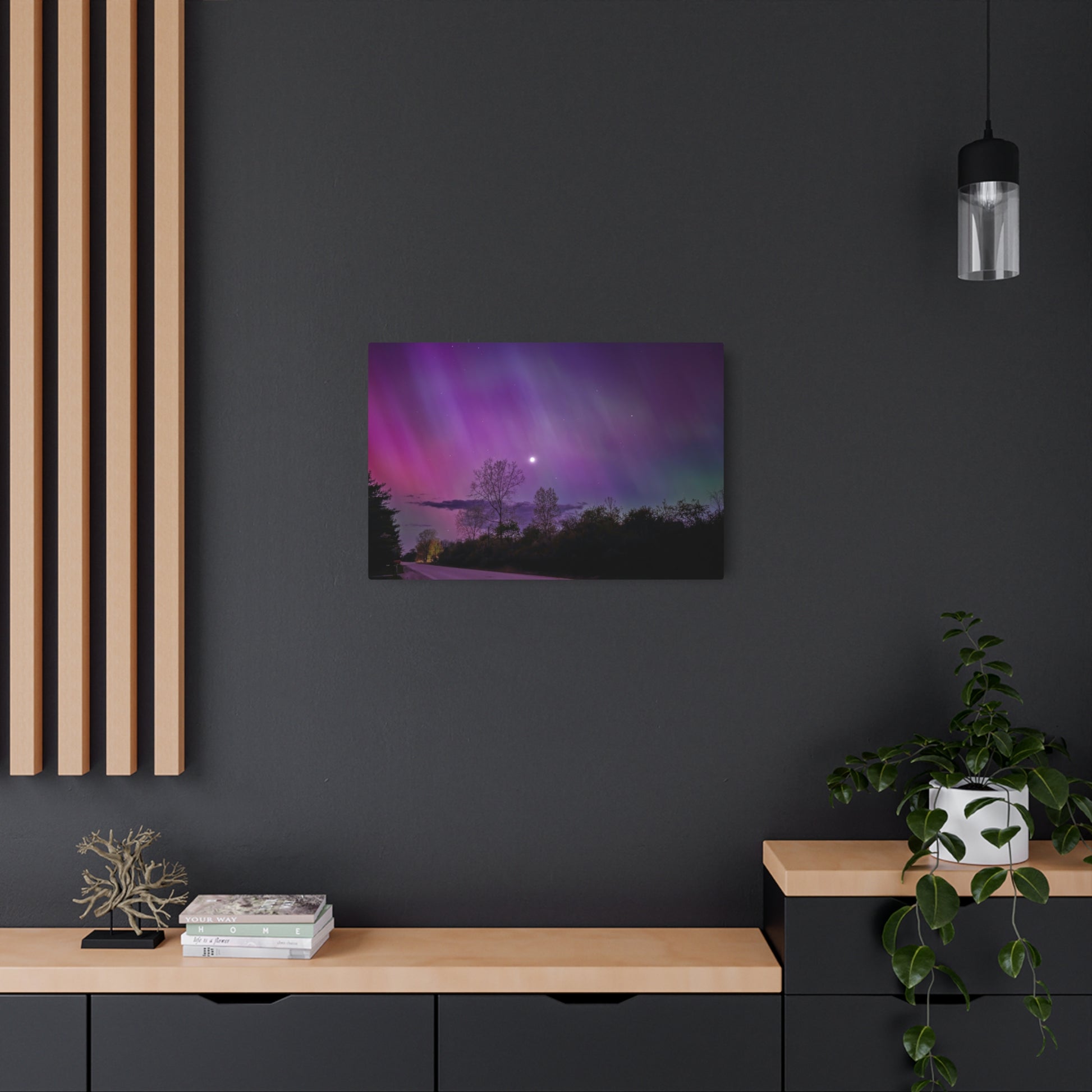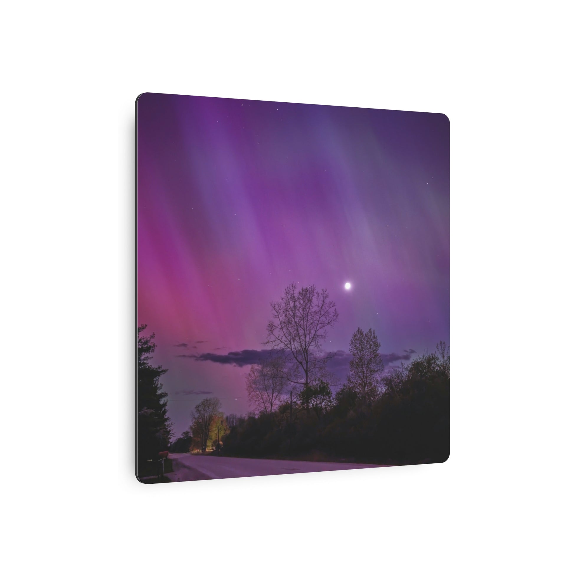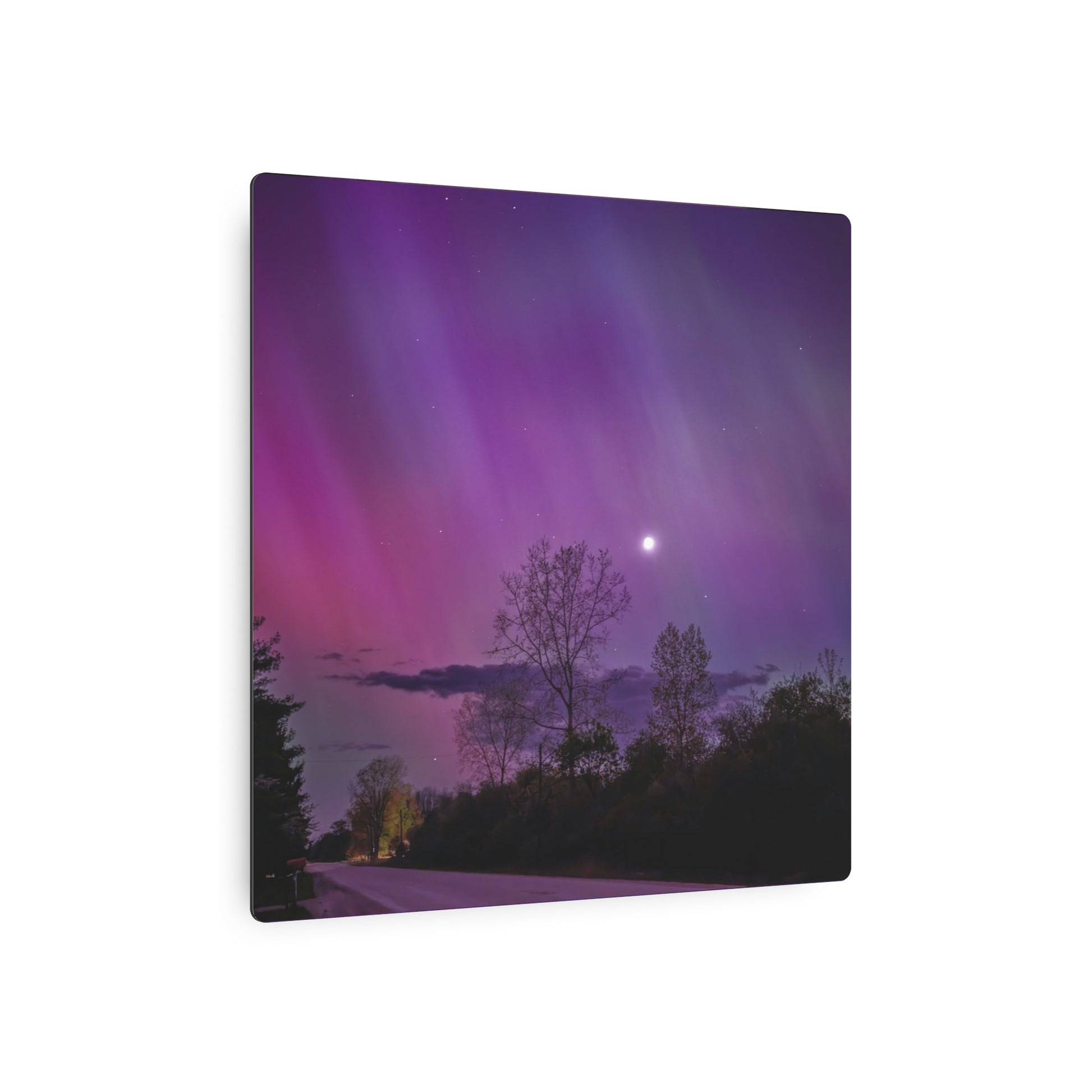 Under the celestial dance of the Northern Lights, a country road in Michigan becomes a stage for nature’s silent symphony. A lone tree, etched in silhouette against the cosmic display, stands as a timeless witness to the universe’s quiet conversation. Above, a sliver of the moon casts a gentle glow, adding a touch of serenity to the scene. This moment, captured in stillness, is an invitation to wander, wonder, and wanderlust under the Michigan skies.